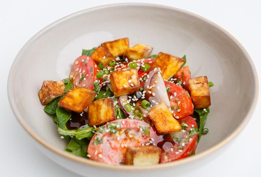 Баклажаны, томаты, кинза, жареный арахис, кунжут, соус сладкий чили, кунжутное масло.